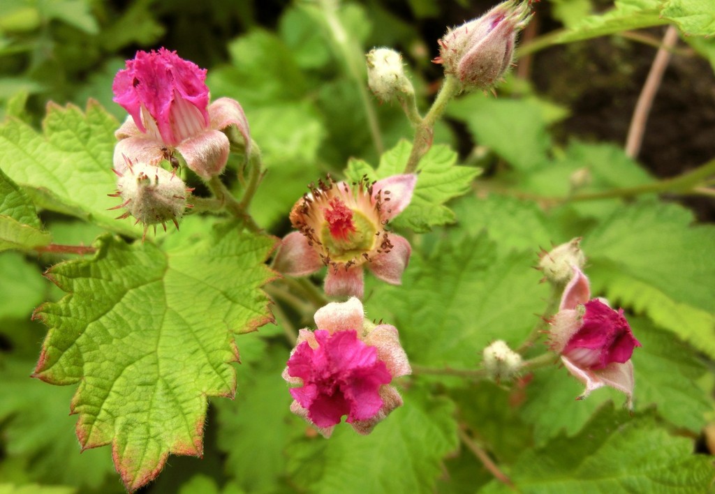 これはきれいなピンク色の花が咲く木イチゴの仲間ナワシロイチゴです。もちろん赤く色づいた実も食べられます。
