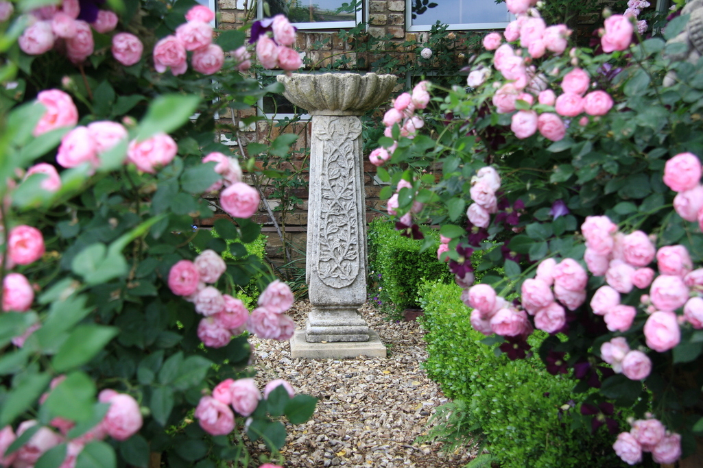 バラに囲まれた素敵なバードバスですね。鳥さんの楽園ですね。