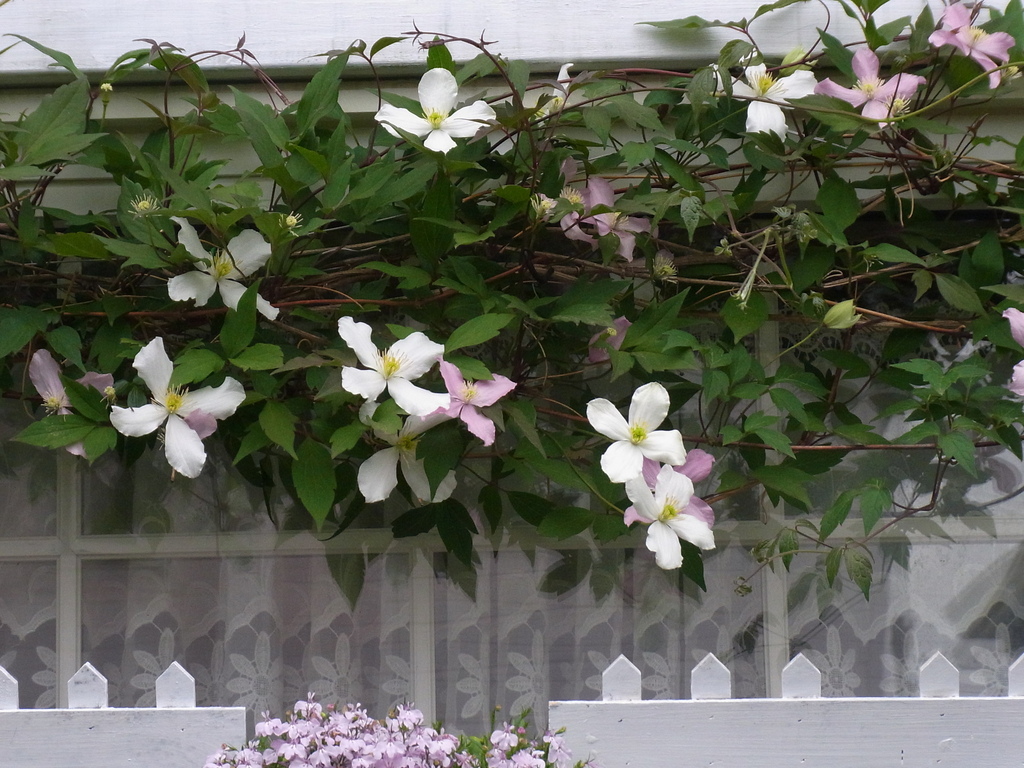 こちらもモンタナ系ですが、ぽちぽちとしか咲きません。多分生育旺盛なフラグナントスプリングに負けているのでしょう。白いクレマチスも可愛いのですが。