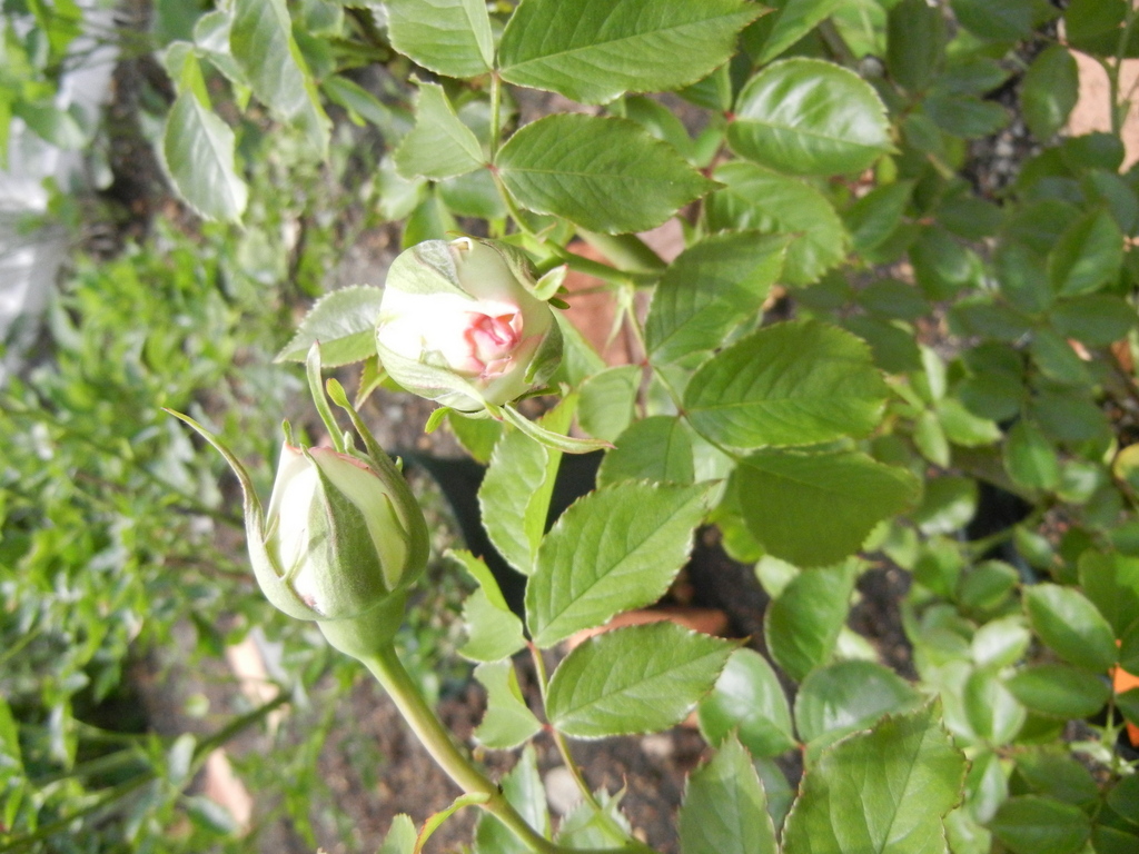 ピエール・ド・ロンサールの枝変わり。まだ鉢植えですが、いくつもつぼみをつけています。
