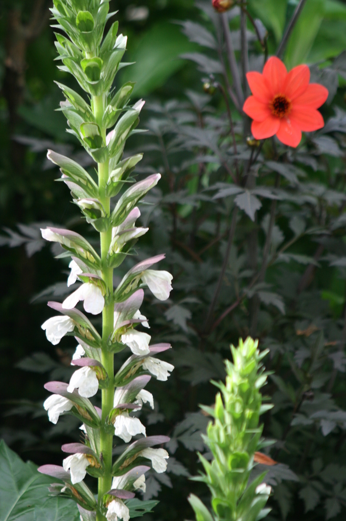 アカンサスモリスと銅葉のダリア・・北九州は真夏日が続いています。ダリアの季節がやってきました~濃いい銅葉と赤のコントラストが素敵です。