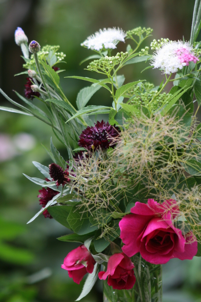 庭の花を摘んで・・源平シモツケ、ヤグルマソウブラックボール、スモークツリーなど。