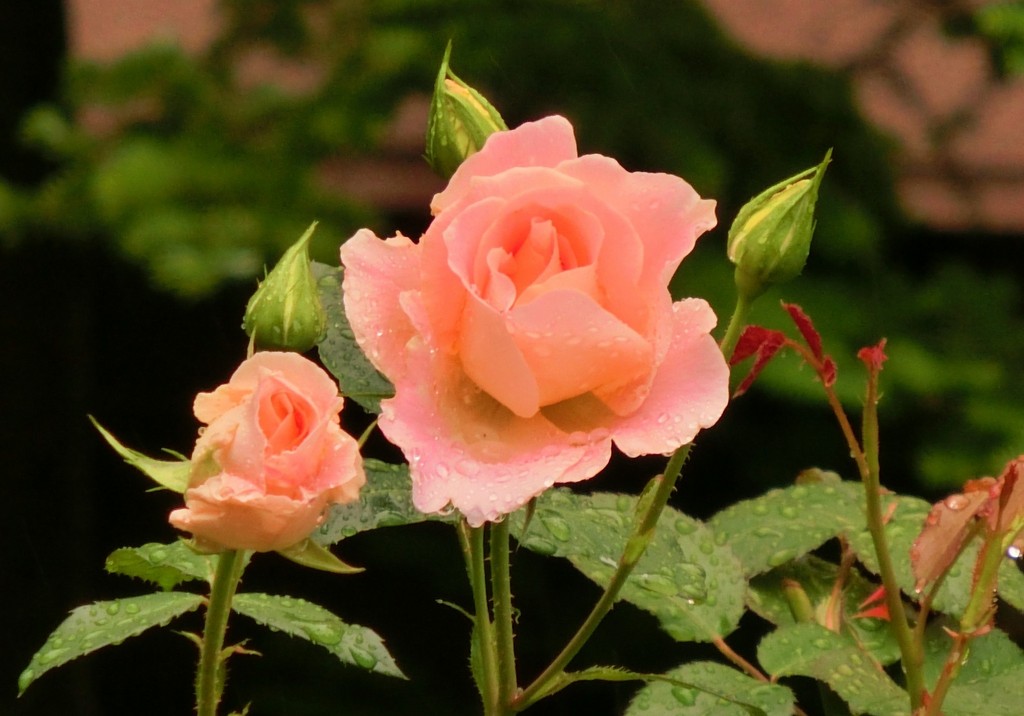 スチールのパーゴラに絡めたロココが雨の中できれいな花を咲かせてくれました。