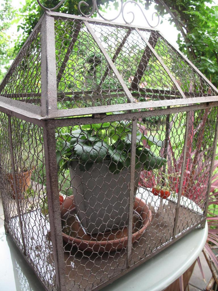 中には苺の苗が一株。 孫のためのたった一株なのに・・・赤くなると鳥が来て食べてしまうので、こんないいものを探しました。 これなら大丈夫!!