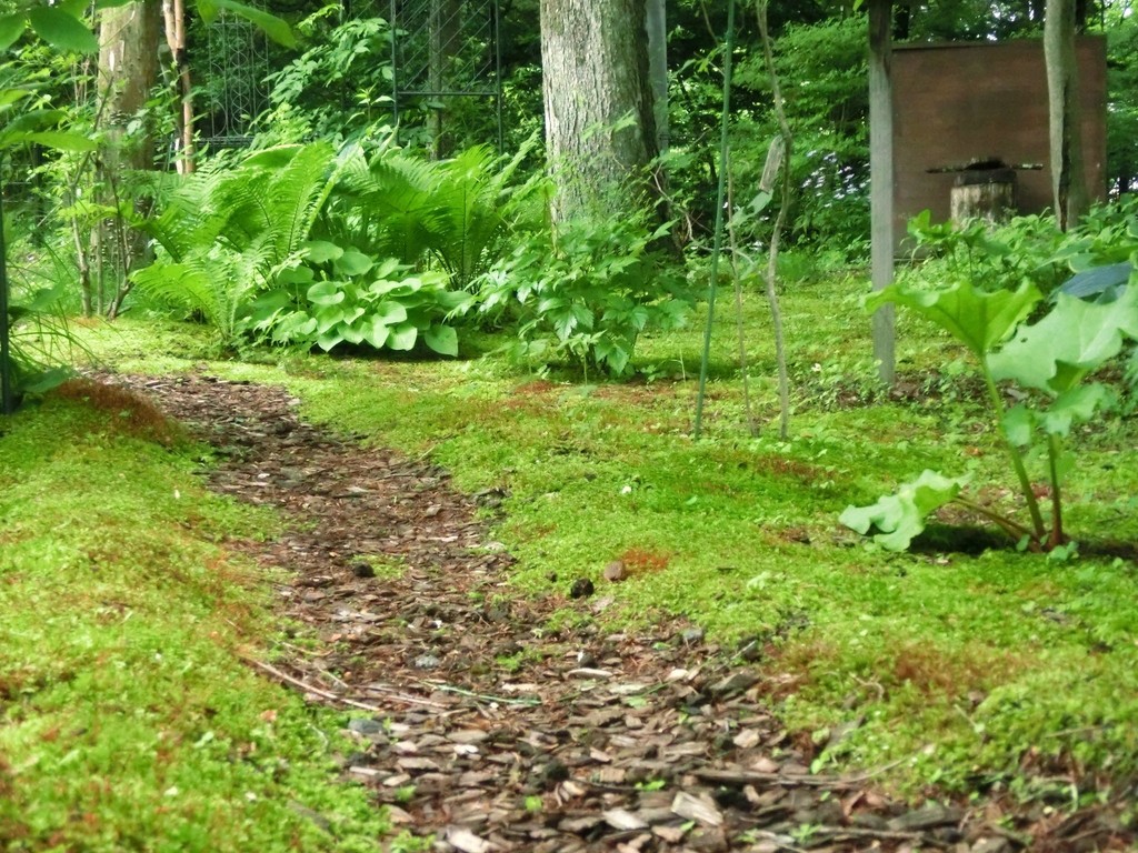 大木の木陰になる苔庭にはギボシやクサソテツ、レンゲショウマなどを中心に日陰を好む植物を中心に植えています。