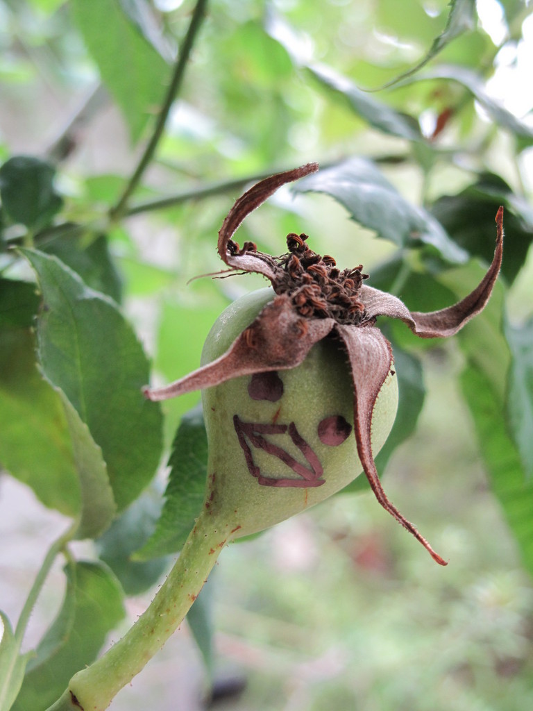 roserianさん、大きなローズヒップ。真似をして顔を描いてみました。どう?