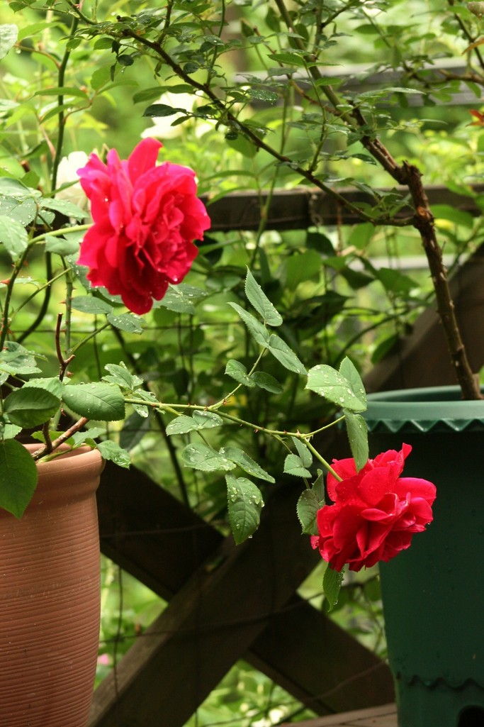 デッキの鉢植えのLDブレスウエイト。大きな花に雨の水滴を受けて、重さに耐えられず頭を垂れています。