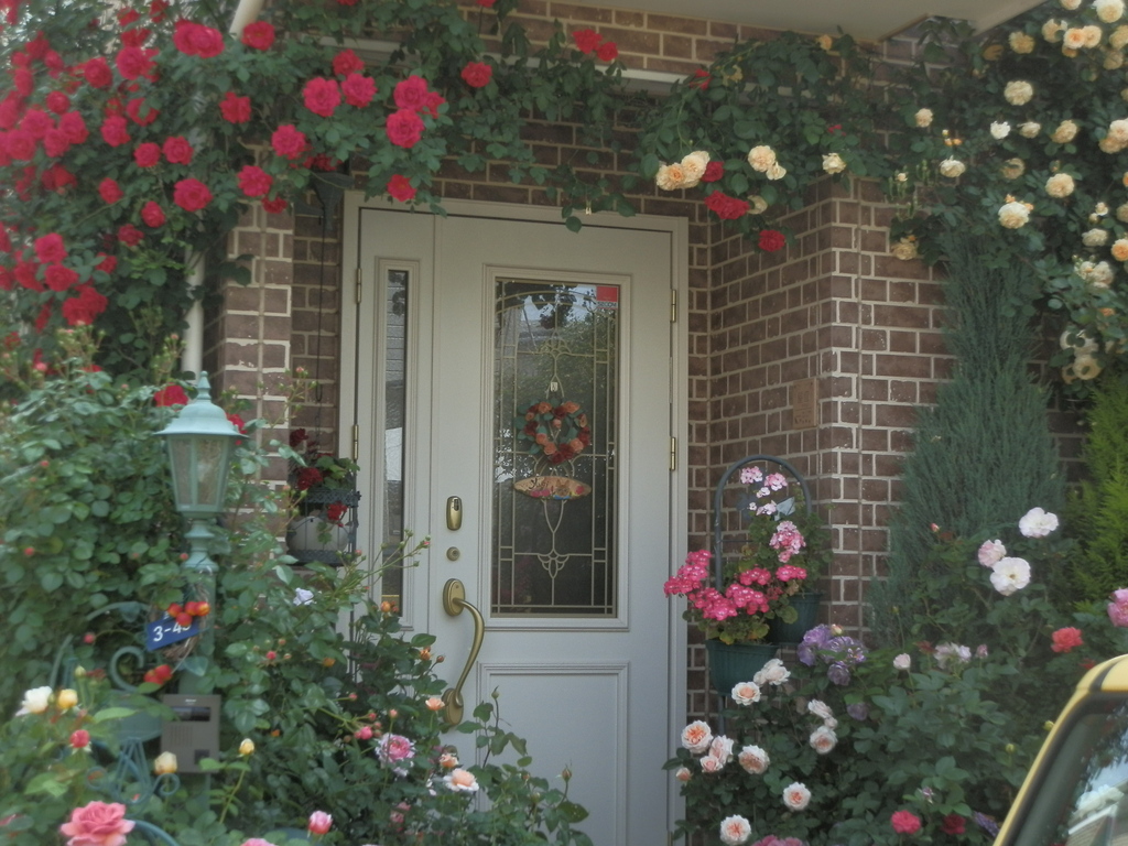 ガーデニングスペースは玄関前のここだけです。 120種の薔薇を咲いた順に目立つ場所に移動します。
