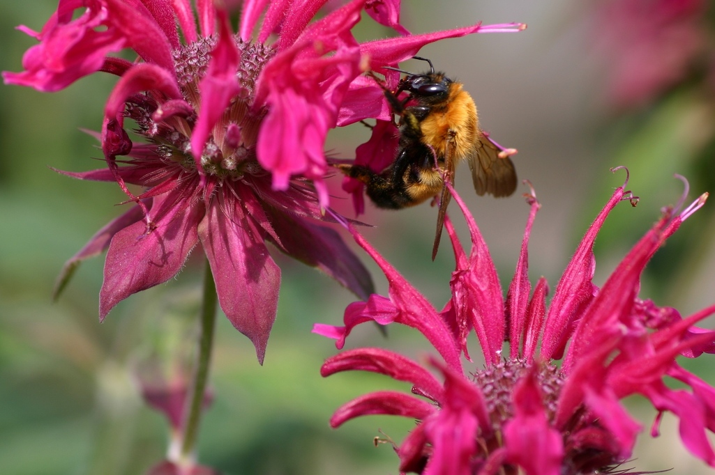 ビーバームの別名のとおり、蜂が集まります。トラマルハナバチでしょうか。