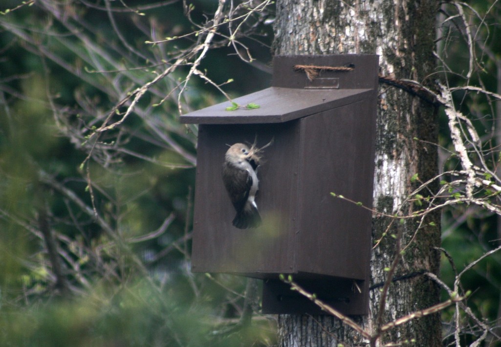 5月上旬、まだ冬枯れ状態の春楡の木に架けられた巣箱に渡り鳥のコムクドリが巣作りを始めました。こちらは雌。