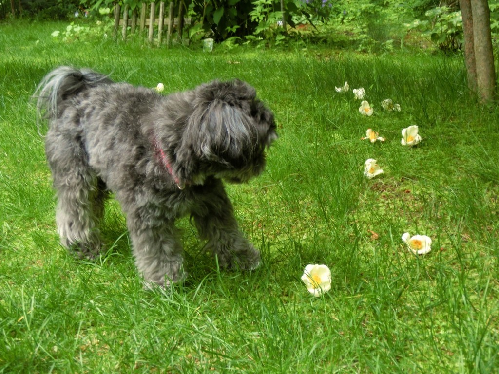 庭で大好きなゴルフボール遊びをしていたクーチャン、芝生に落ちている姫シャラの花を見つけてこれは何だろうって見つめていました。