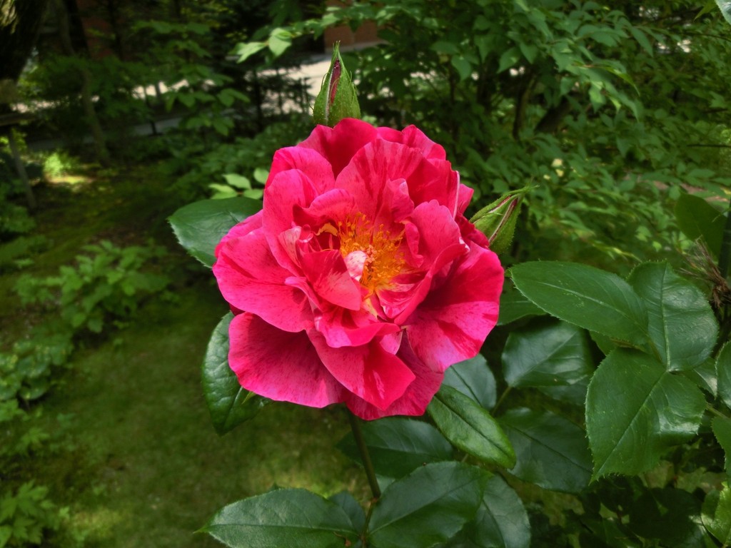 ギー・サヴォア。庭の中心でフォーカルポイントに植えています。斑入りの赤い豪華な花が大好きです。ステムが強いので梅雨の雨にも負けません。