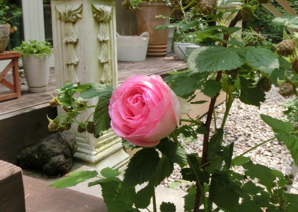 ピエール・ド・ロンサール。ほとんどは咲き終わったのですが、根元近くの蕾が今頃になってきれいな花色で開花しました。横にあるのはまだ赤くなっていないラズベリー。