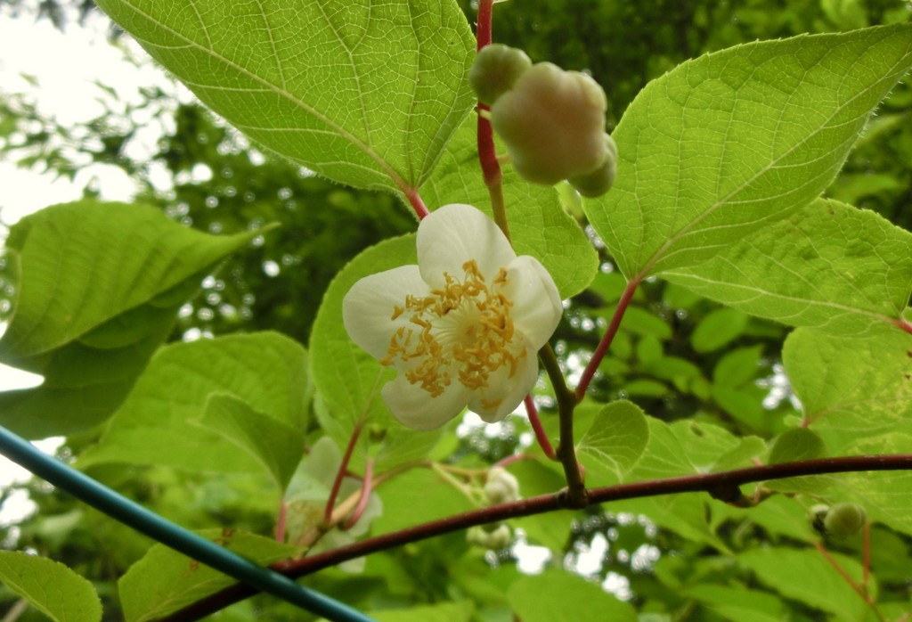 今マタタビにはこんな可愛い花が咲いています。これがあの猫ちゃんが大好きなマタタビの実になります。白くなっている葉っぱはやがて普通の緑に葉っぱになります。