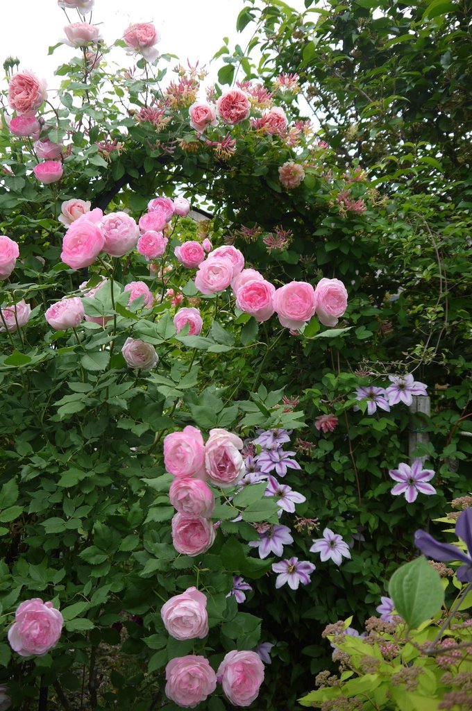 1カ月前の画像になります。アブラハム・ダービーとハニーサックルのアーチ付近は、マダム・ピエールオジェやクレマのビージュジュビリーで、ピンクコーナーになっていました。