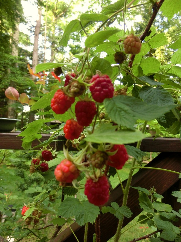 庭の果実がやっと食べごろに色付いてきました。これはラズベリー。かんだ時の香りが大好きです。