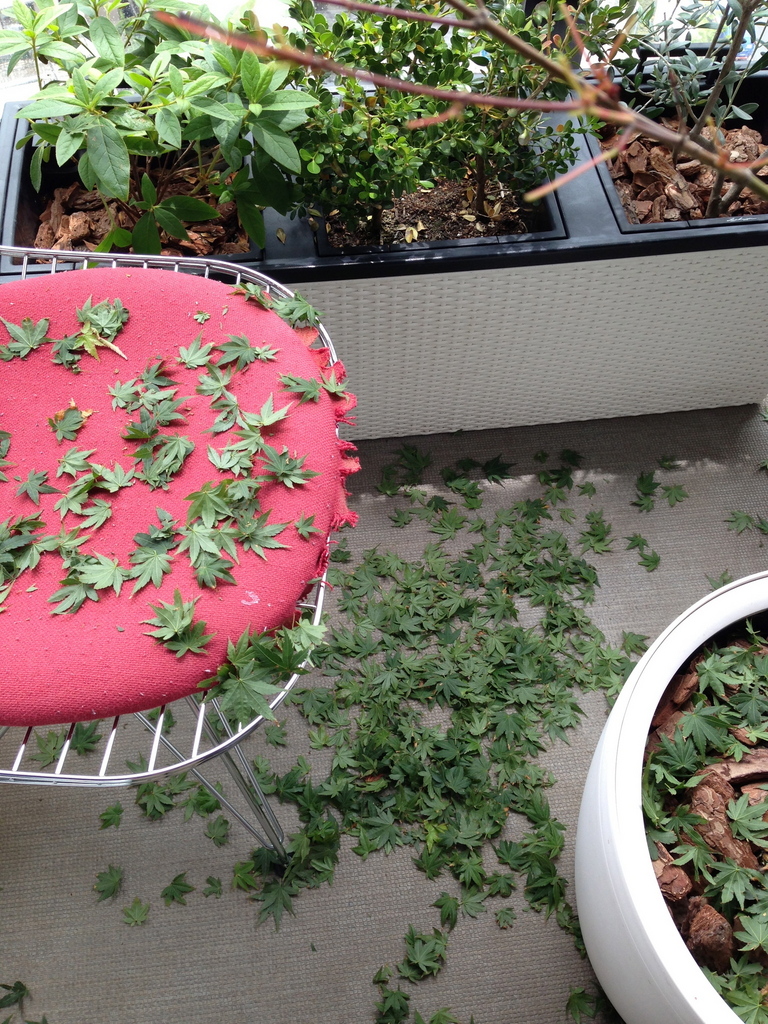 今年京都から取り寄せた紅葉。芽が出てから配送だったので、葉っぱがボロボロに。梅雨に入って葉狩りしました!