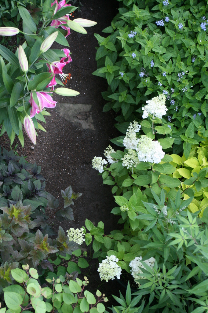 ユリ・ノリウツギ・ブルーの花はユーパトリウム(西洋フジバカマ)です。チョコラータの花はもうちょっと先ですが葉っぱのコントラストが好きです。
