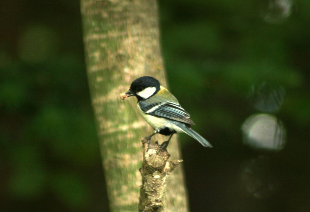 庭の巣箱で子育てをしていたシジュウカラ。昨日出かけている間にほとんどが巣立ったようでしたが、どうやら一番あとに生まれた雛がまだ残っていたようで、親がエサを咥えてきました。
