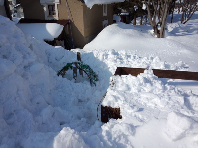 凄い積雪で、雪国のご苦労がこの写真からよく理解できます。幸に埋もれたパーゴラからはバラの咲き乱れる姿は想像できませんね。