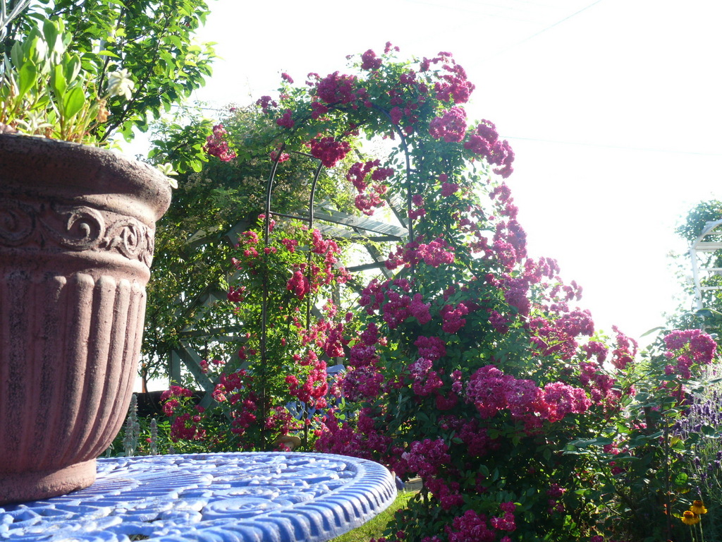 大きな鉢に負けないアーチのバラのボリューム。見事につりあっていますよね^^