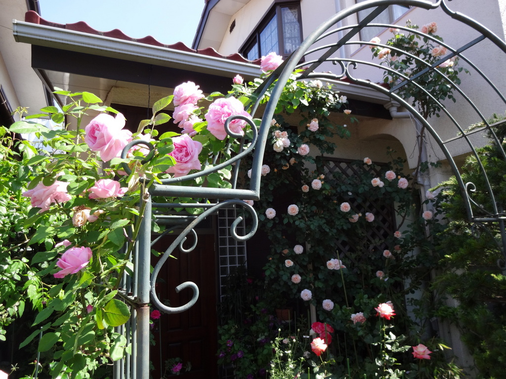 アーチに絡んでいるバラは挿し木の鉢植えです。色々試しているけれど、まだ決められないアーチのバラ。