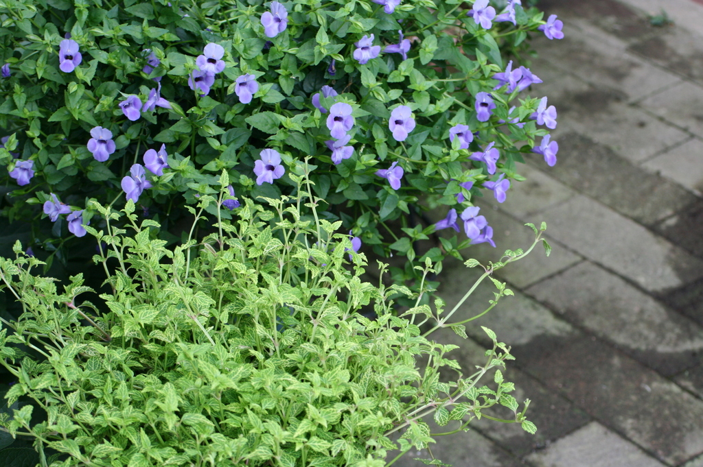 夏に強いトレニア類・これからの季節、秋まで次々と咲き続けます。特に黄金葉のトレニアブルーインパルスは花がなくても葉脈が美しくカラーリーフとしても楽しめます。