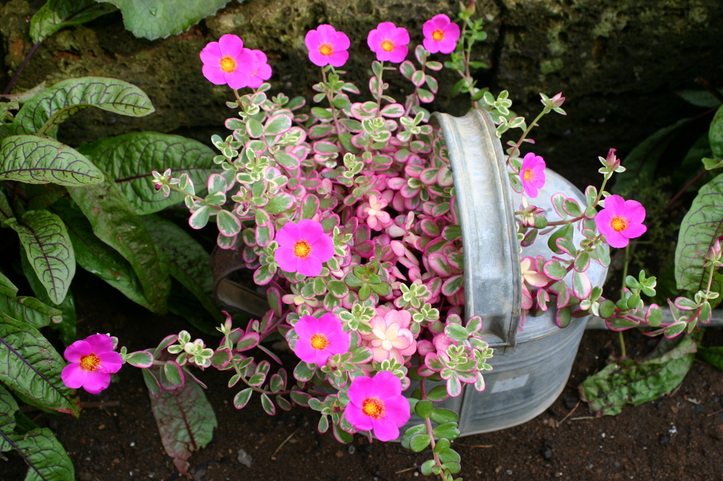 壊れたジョウロに植えたポーチュラカ