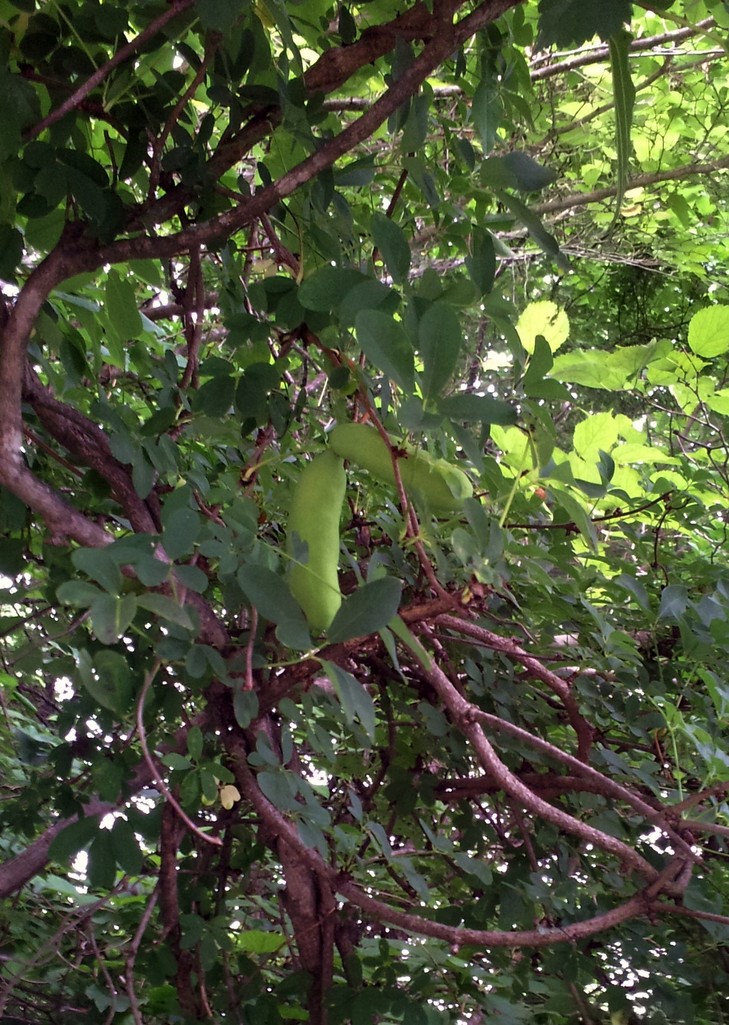 これは、大分大きくなってきたアケビの実です。薄紫に熟して割れるととっても甘くて美味しい実になるのが楽しみです。