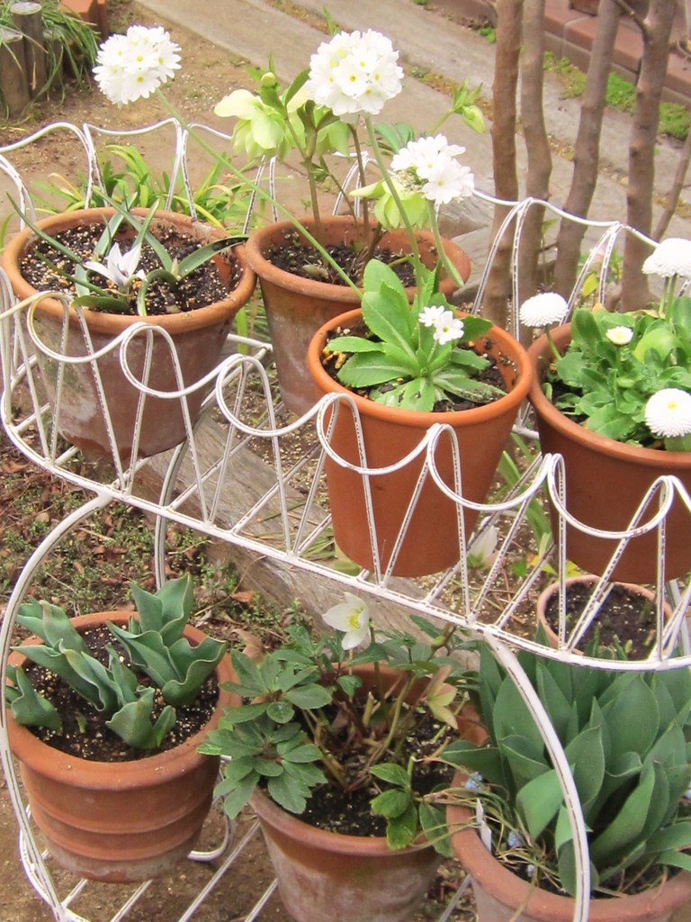 白い花ばかり、私も集めたくなりますよ。プリムラ・デンティキュラータの丸い花が可愛いです。