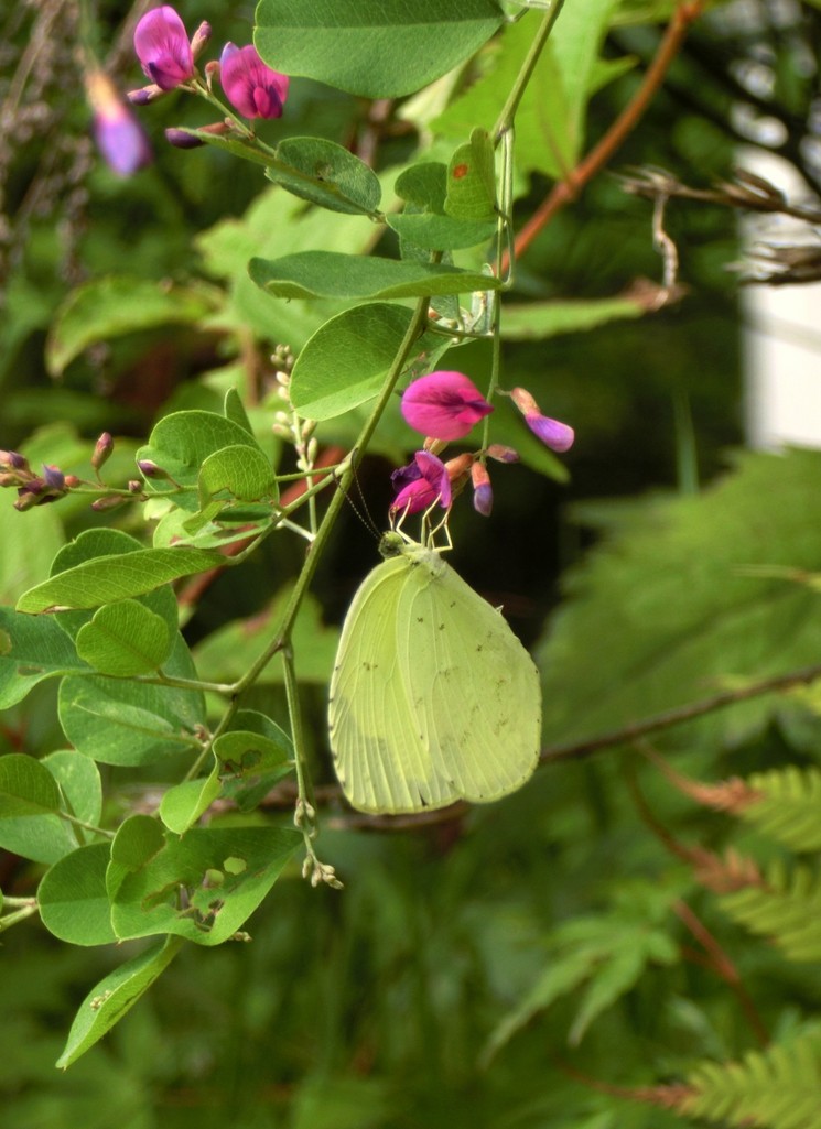 萩の木の周りを飛んでいたキチョウが、花にとまったところをパチリ。