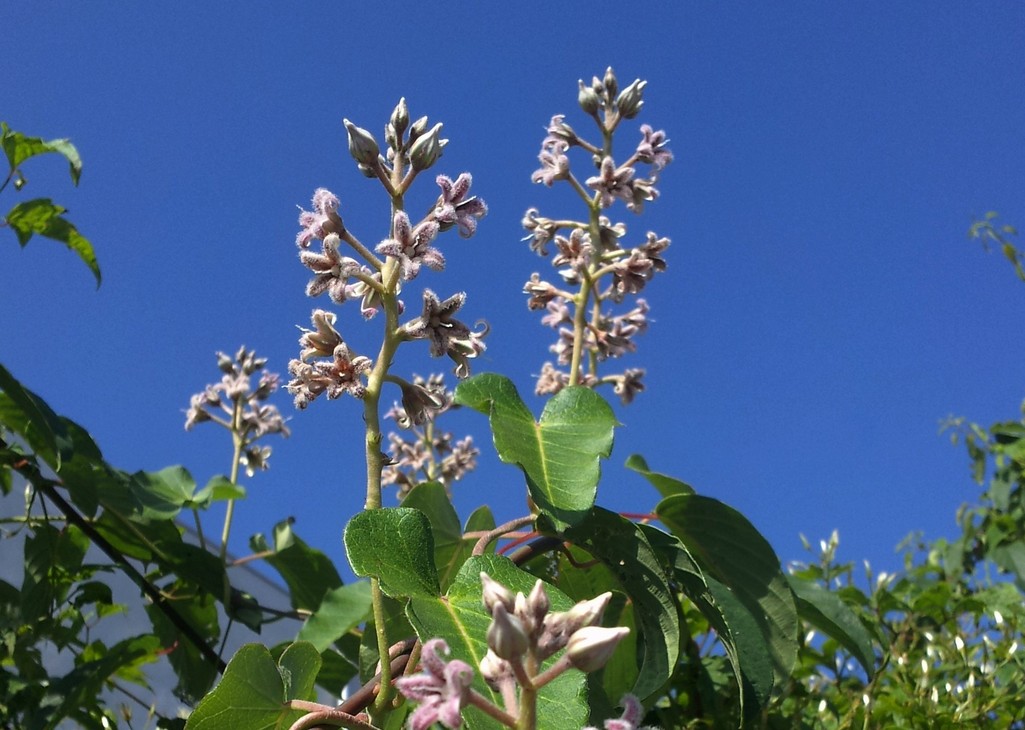 青空を背景に咲いているのはつる植物のガガイモの花。この花後にできる種が昔は「ケサランバサラン」という長い綿毛をまとった生き物だと云われていたようです。