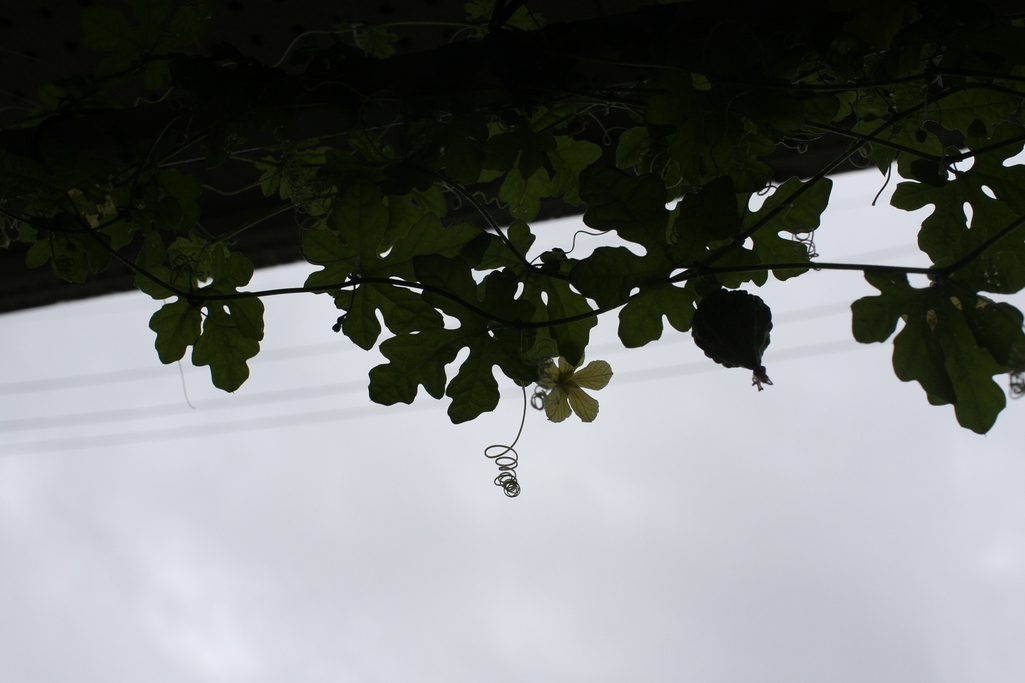 ゴーヤを窓に誘引しています。ツルのクルクルがとってもキュートです。