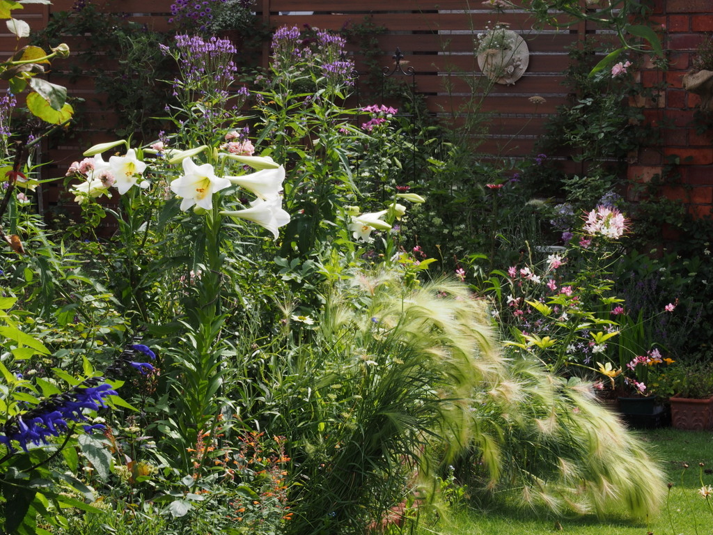 dyさんの魅力が一杯つまった涼やかな素敵な夏の庭ですね。グラス・ホルデウム?が爽やかで美しいですね。