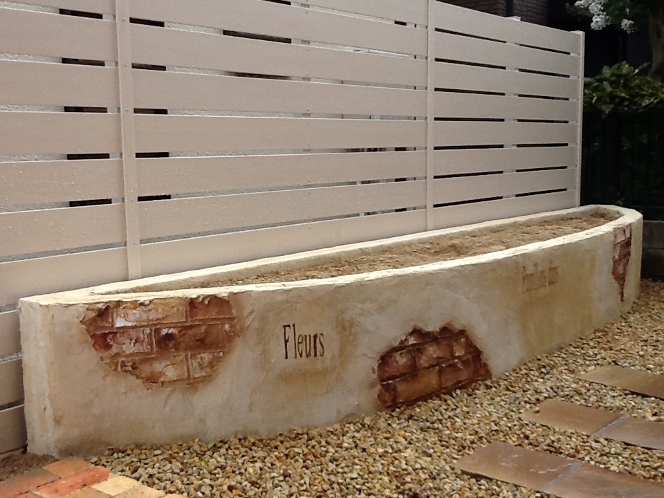 モルタル造形でアンティーク感とファンタジー感を醸し出した花壇が完成しました。 植栽部分を腰高にしていますので 椅子に座って草花との語らいが 出来ると思います。