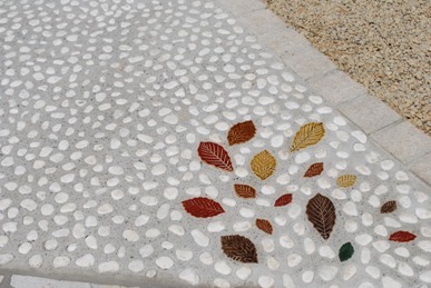 お庭のアプローチです。 白玉石を丹念に埋め込み リーフのタイルをポイントに デザインしてみました。!(^^)!