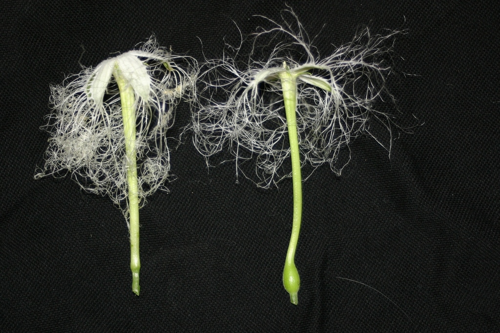 昼間の見分けは、子房のふくらみで容易にできます。写真は夜の開花時ですが、蕾でも雌花の子房はふくらんでいます。