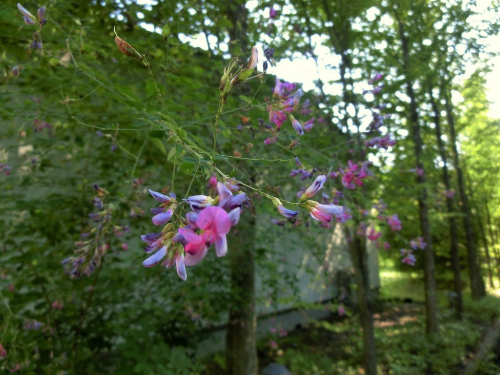 とある別荘の外構の桂並木を背景に萩が可憐な花を咲かせていました。