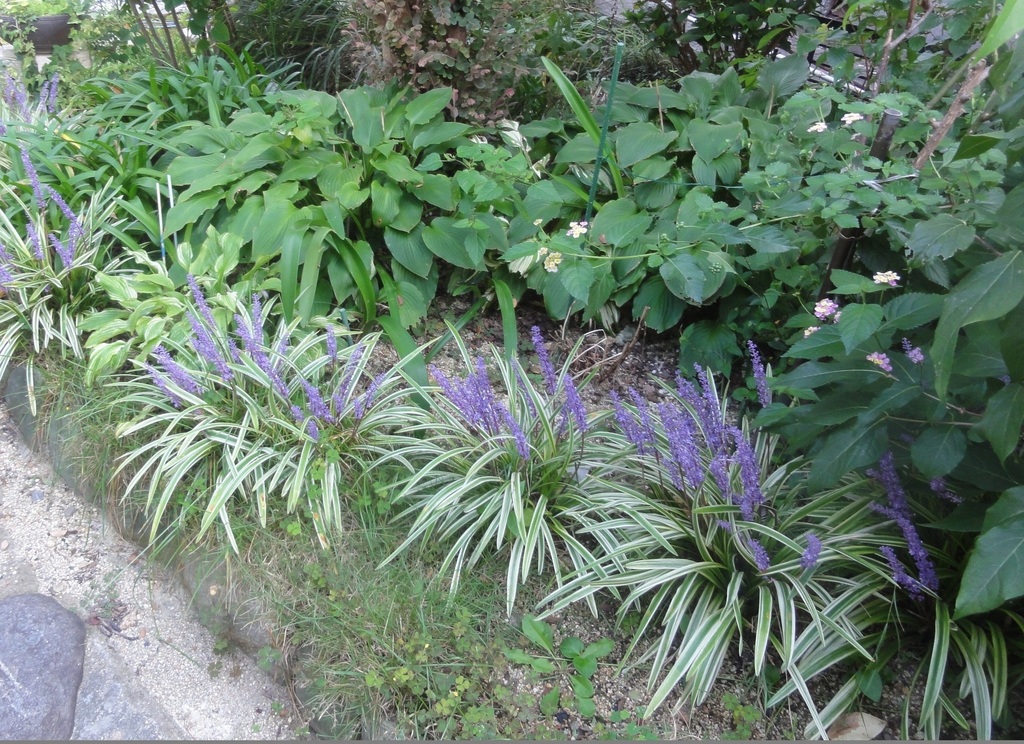 列稙のヤブランの青いつぶつぶの花が斑入りの葉っぱと対比がきれいです。