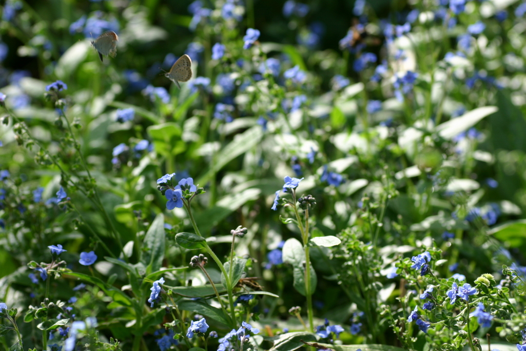 台風一過、陽光のなかアンチューサ・タッセルブルーに沢山の昆虫が来訪