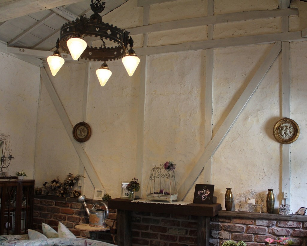土壁、柱、梁はそのまま保存して白く塗装していただきました♪アンティークのシャンデリアにぴったりな空間です♪