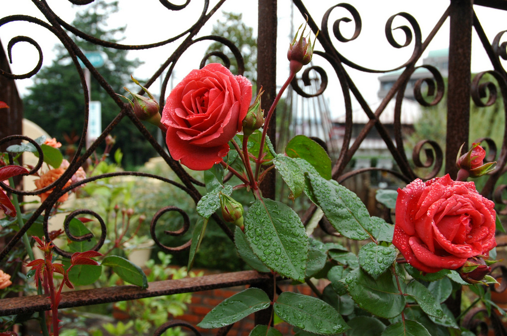 アイアンフェンスのさび色と薔薇の少し渋めの赤が、なかなかいい感じです。