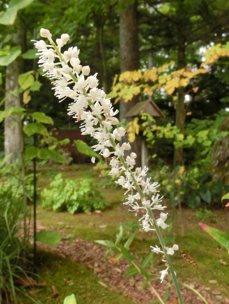 庭には以前からレンゲショウマはありましたが、同じショウマでもまったく違うサラシナショウマも今年お招きしました。なかなか花が咲いてくれなかったのですが、やっと真っ白な花を咲かせてくれました。