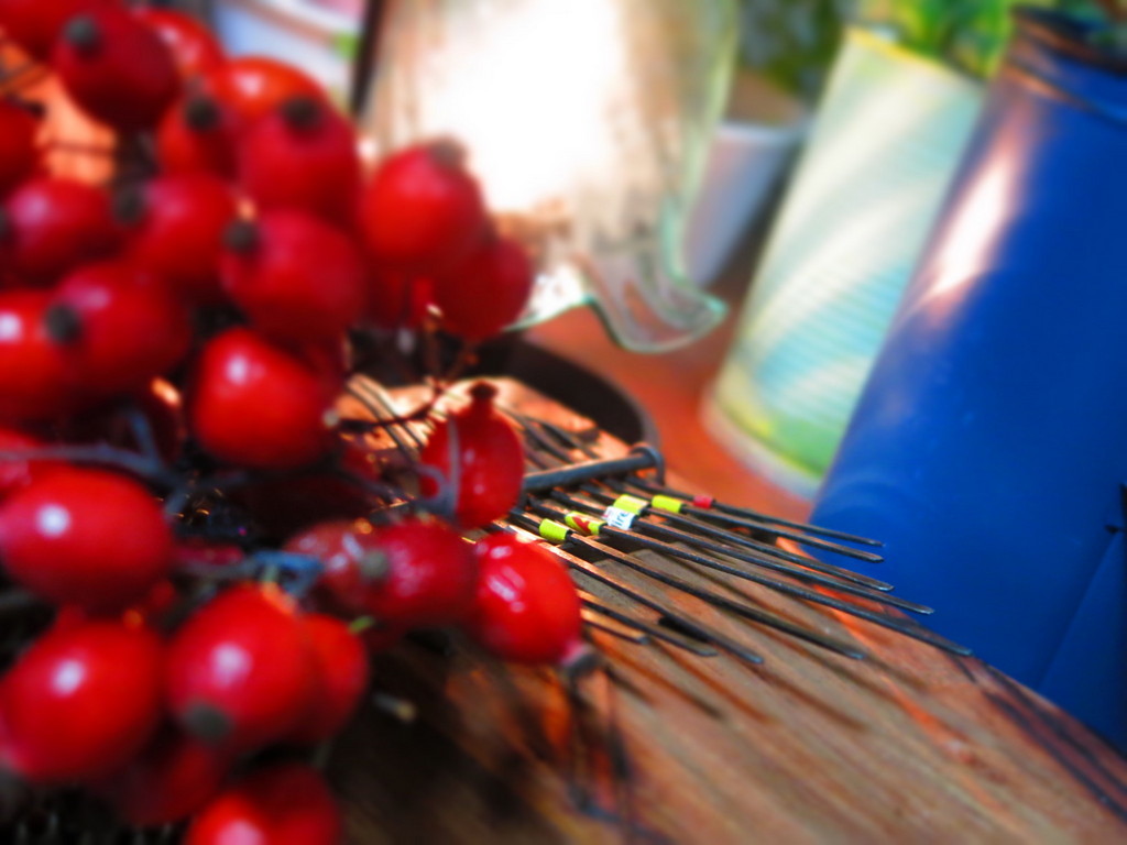 夜の一時、カリンバ(木のピアノ)の音色を 聞きながら~。すずなりばらの赤い実が熟しすぎてしまいました。
