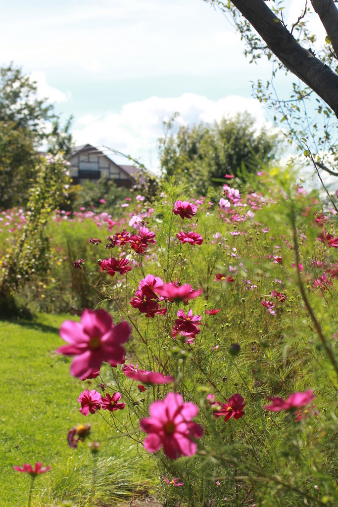 コスモスが秋の風に・・揺れて・・北海道の空の下・・寝転んでみる・・