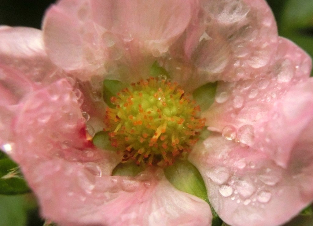 雨上がりの朝のピンクのイチゴの花です。イチゴもバラ科なので一重のバラの花みたいに見えます。