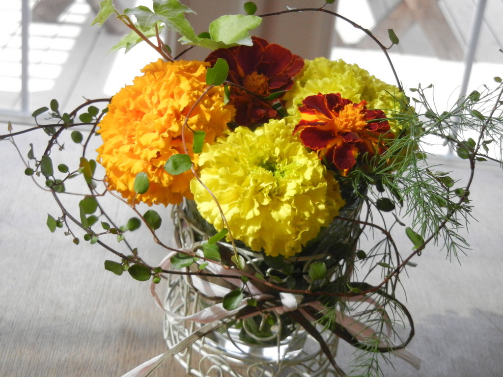 まだきれいに咲いています。ビタミンカラーのアレンジメントです。