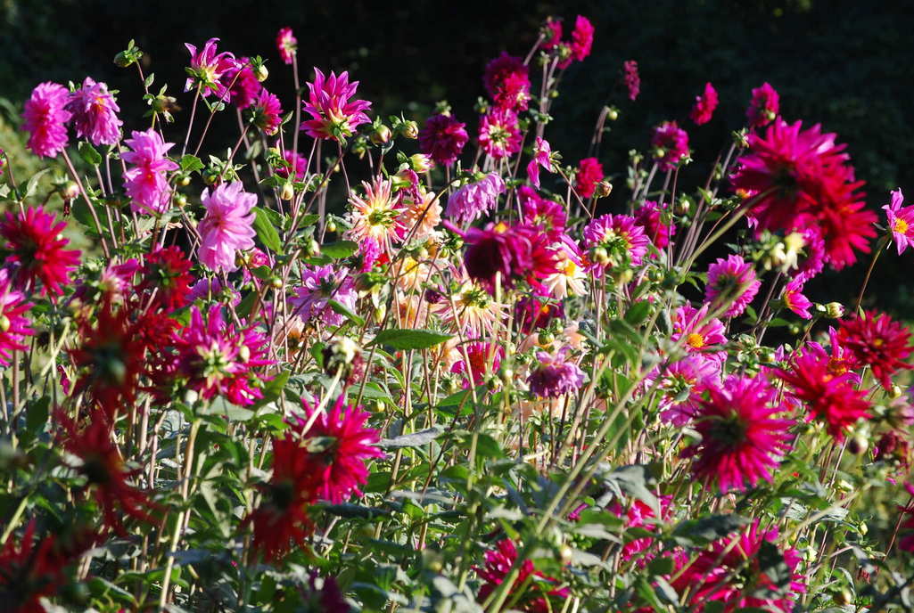 鮮やかな色の花々が日を受けて輝いて、とても素敵です。