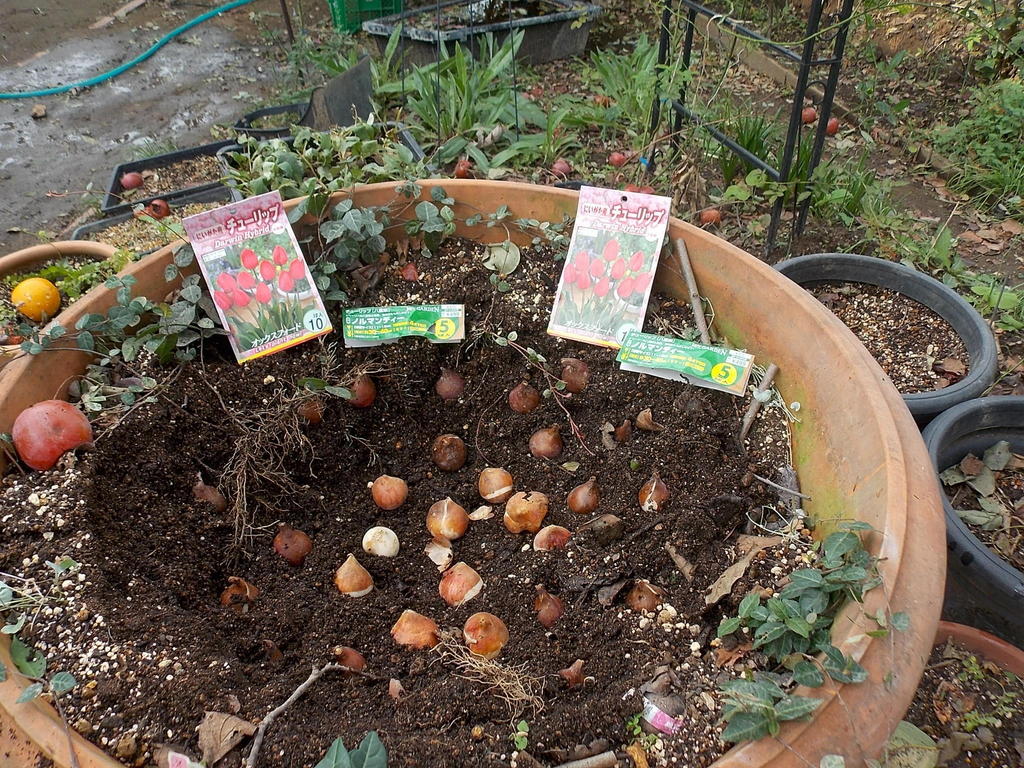 大きなテラコッタに八重の薄紫のチューリップ”ノルマンディ”真っ赤なオックスフォードをそれぞれ植栽。