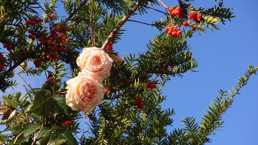 伸び放題のオンコの木に ツルバラのシーザーが絡まって